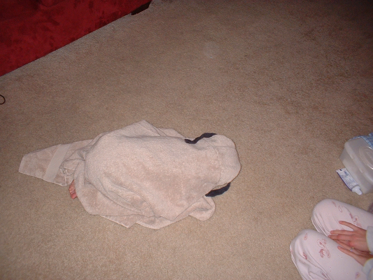 This is a funny picture of William. After my kids have their baths, we get them dressed in the living room (more room to move), so the kids always run in and curl into a little ball on the floor to stay warm.